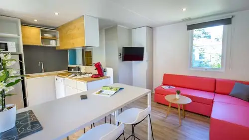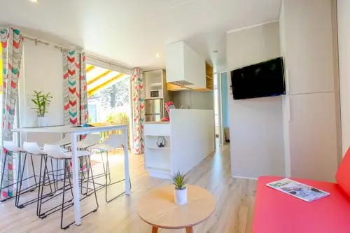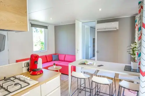 Le salon convertible est agencé de manière à vous offrir un maximum d’espace où vous profiterez de la climatisation et de la télévision en séjournant dans ce mobil-home du camping du Var.