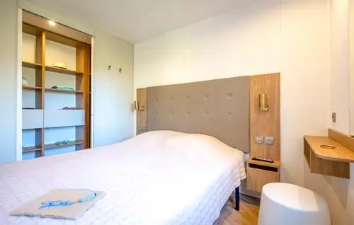 • Vaste chambre parentale avec dressing et télévision • Chambre avec 2 lits simples (lits 80 x 190 cm) • Salon panoramique convertible • Climatisation • Télévision • Cuisine équipée • Lave-vaisselle • Four • Salle d’eau • WC séparé • Terrasse couverte • Salon de jardin • Bains de soleil • Stationnement pour une voiture