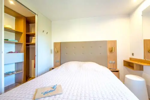 Une chambre parentale avec un large dressing et télévision, une chambre avec deux lits simples, une salle d’eau grand confort avec sèche serviettes, WC séparés, une cuisine équipée avec four et lave-vaisselle, un salon convertible panoramique avec canapé d’angle, climatisation et une deuxième télévision.